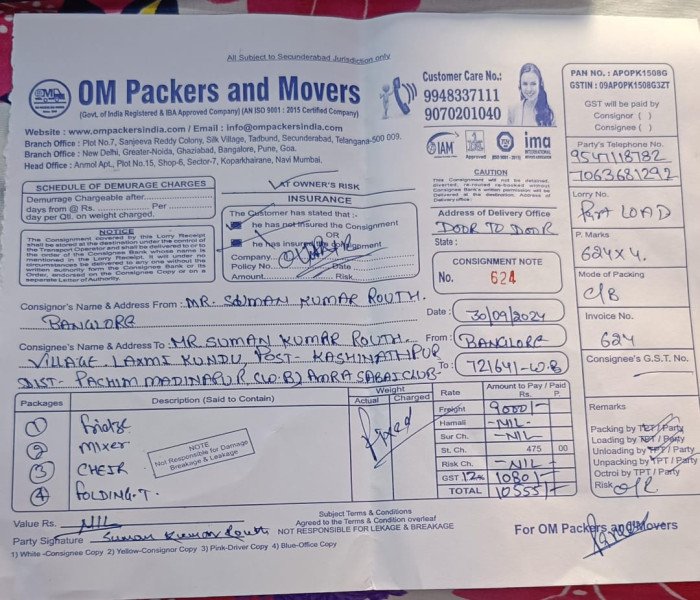 I am Suman Kumar Routh . I booked Global Logistic and Movers to port my luggage from Bangalore to West Bengal on 30th Sept , 2024 . I am attaching the...